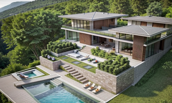 The villa is crafted with eco-consciousness at its core, incorporating sustainable building materials, energy-efficient solutions, and water harvesting systems to minimize environmental impact. The home embraces nature through indoor plantations, and a variety of native flora that enhance air quality, reduce heat buildup, and add a vibrant, natural aesthetic. A thoughtfully designed series of landscaped terraces flows across the villa’s levels, incorporating natural stone pathways, lush lawns, and quiet nooks for relaxation.