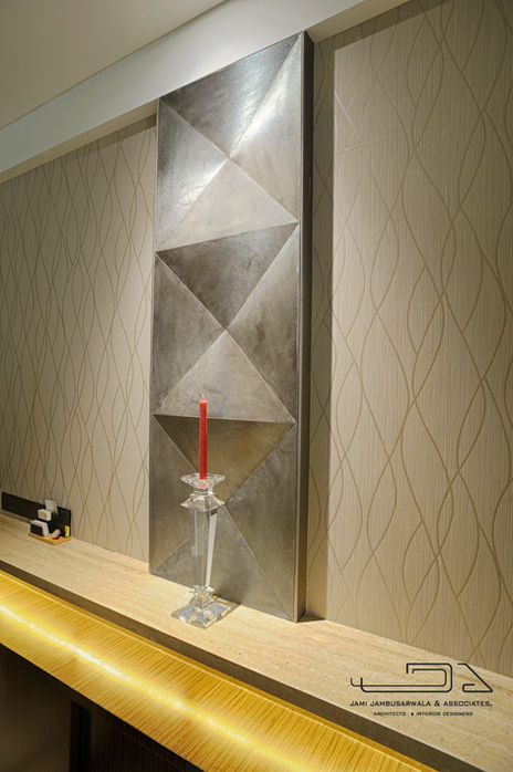 Designed for a leading diamond processing and manufacturing group, JJ&A has successfully executed its design process for this gorgeous 7500 Sq.Ft. office, following the client’s brief of balancing out an Indo-contemporary concept to suit a modern day company headquarter. From the intricately inlaid floor pattern at the reception made using only material left over from various parts of the office, to the wooden carved highlights on the large entrance doors and the backlit diamond pattern ceiling, these elements were brought together to echo the brief through the entire space. Highlights here include the massive glass lined passages with the floating wooden elements, a unique triangular shaped 9-seater conference room, custom built hand-crafted furniture, and unique use of hand-picked materials showcasing our design talent and exquisite workmanship.