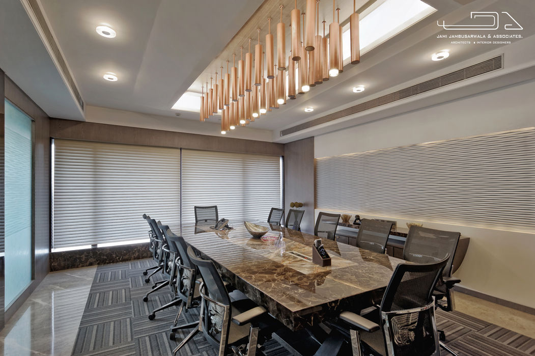 Spanning 15,000 Sq.Ft. on a single floor-plate – often significantly more challenging than working with a smaller canvas – JJ&A has detailed every corner of this modern office for one of India’s leading diamond processing and manufacturing groups. Fascinating textures, colours and a use of unique materials all brought together to create a modern office space that allows for focused working. The arterial passageway boasts a detailed facetted ceiling design that forms the highlight of the entire office. Each workspace has been carefully curated taking its occupants needs and requirements into account.