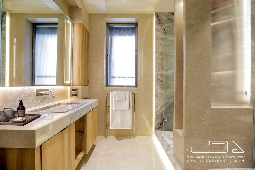 Perched on South Mumbai’s elite Ridge Road, this 6,000 Square Foot modern apartment has a commanding view of the Arabian Sea. With tasteful luxurious touches peppered throughout the apartment, from the extensive use of book-matched Michelangelo marble for the flooring to the use of materials like wood and rope in the partitions, this home has been designed to withstand the passage of time. The kitchen island platform doubles as a breakfast bar – perfect for those lazy Sunday mornings. Intricate carvings combined with the clever use of materials makes this home as on-trend as it is timeless. The children’s bedroom is a burst of colour and energy – the rope material used for she shelving and artwork lends a rugged and fun element to the space. A private Spa area complete with steam and Jacuzzi facilities adds that special touch.